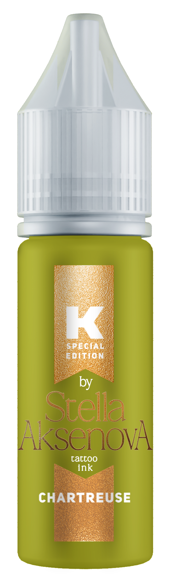 A warm yellow-green shade that brings energy and vivacity to the world of tattoos. Its name is due to the French liqueur "green chartreuse", the color of which is due to the infusion of 130 herbs included in its composition.